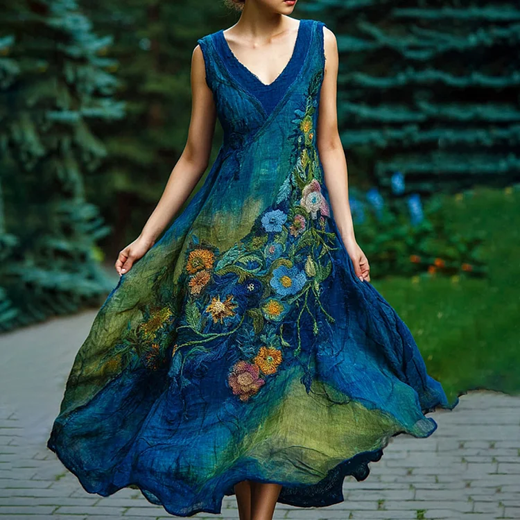 Vintage Oil Floral Embroidered Art Comfy V Neck Linen Maxi Dress