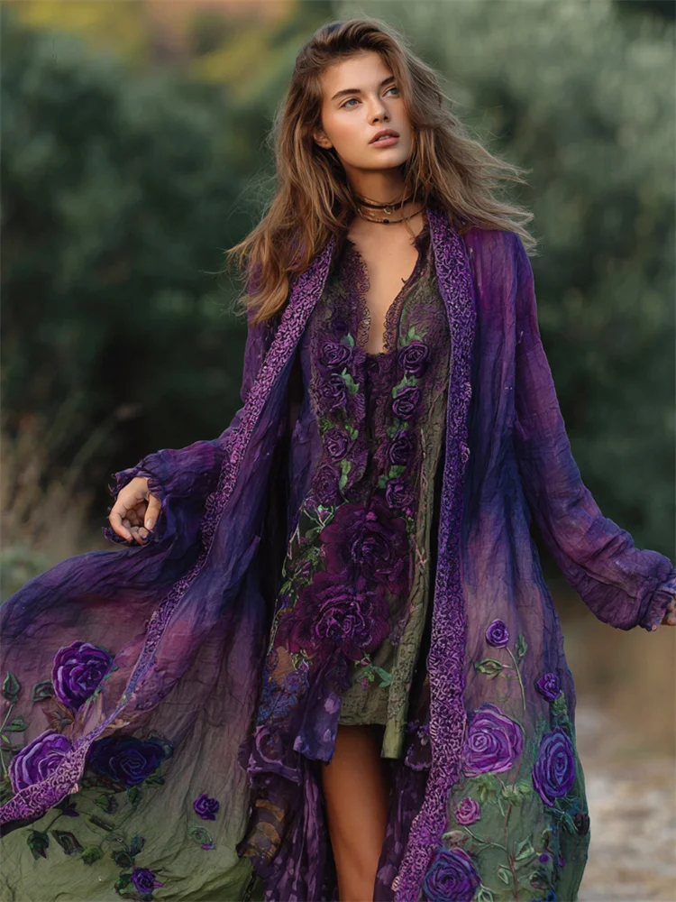Vintage Purple Roses Embroidered Dyed Flowy Linen Cardigan