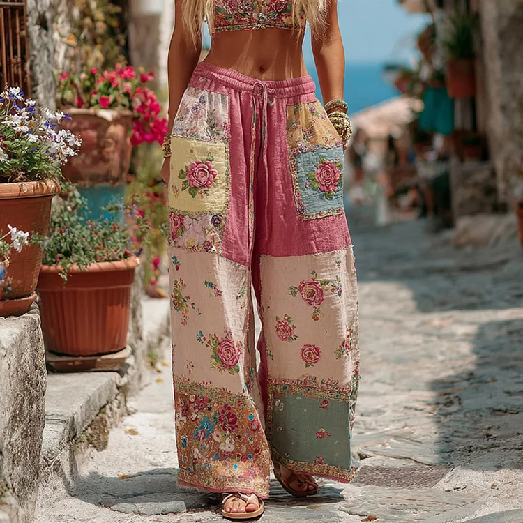 Vintage Retro Rose And Floral Patchwork Art Linen Pants