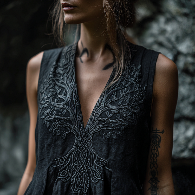 Vintage Viking Tree Of Life Embroidered Linen Tank Top