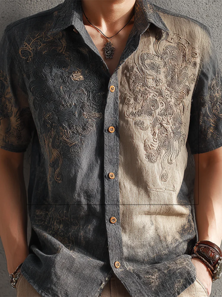 Western Style Retro Cotton And Linen Men's Casual Short-sleeve Shirt With Floral And Animal Elements
