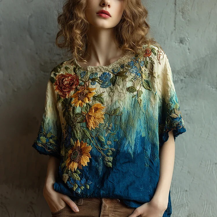 Women‘s Vintage Flower Embroidery Gradient Round Neck Linen Blend T-shirt