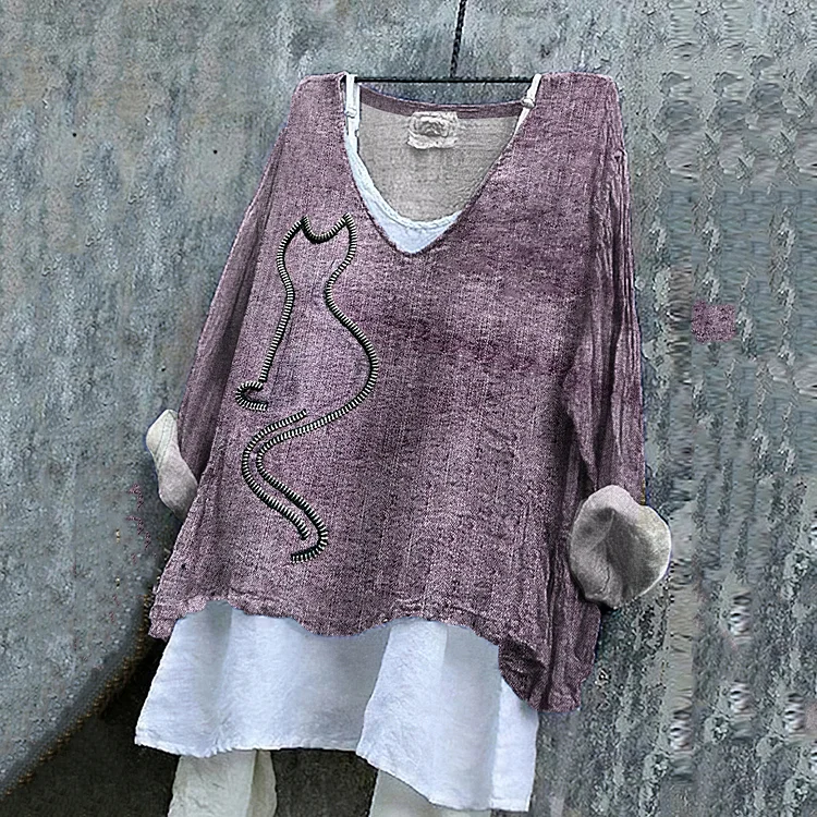 Women's Abstract Zipper Cat Art Cotton And Linen V-neck Shirt