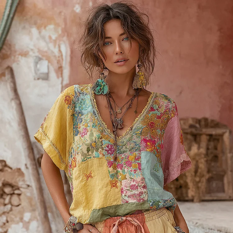 Women's Bohemian Floral Embroidery Patchwork Art V-neck Linen Blend T-shirt