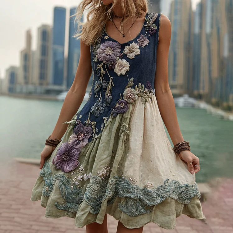 Women's Classy Gradient Japanese Sakura Cherry Blossoms And Sea Wave Embroidered Cotton And Linen Tank Dress