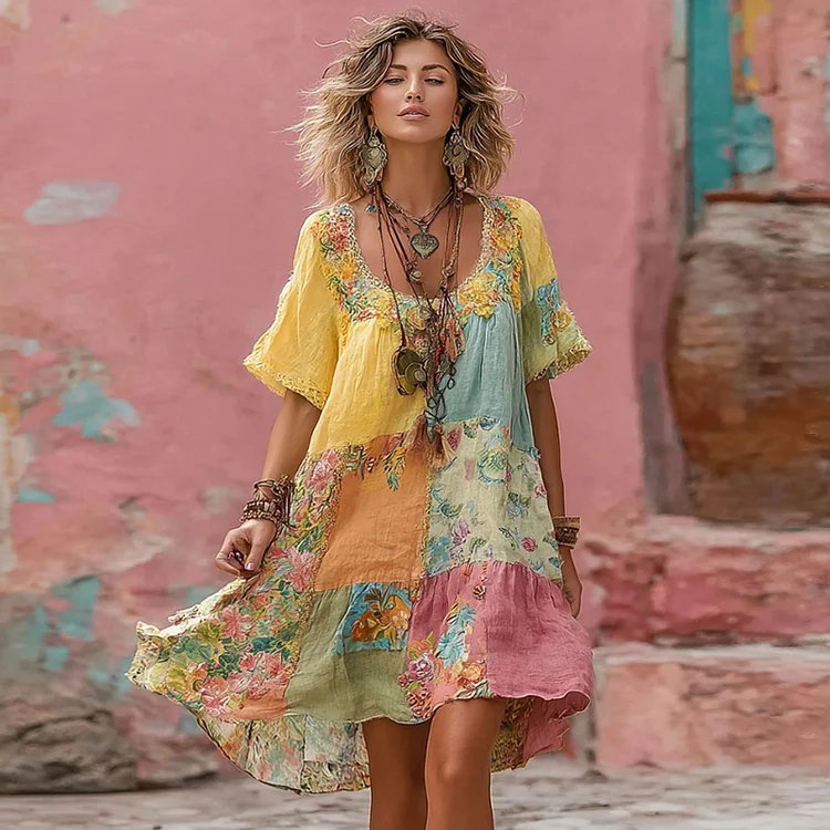 Women's Flower Embroidery Macaron Patchwork Art Crew Neck Linen Blend Midi Dress