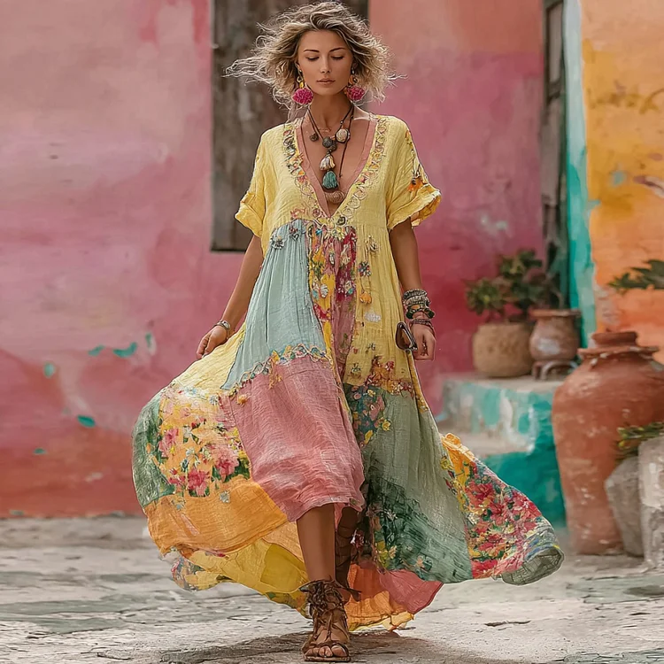 Women's Flower Embroidery Macaron Patchwork Art V-neck Linen Blend Maxi Dress