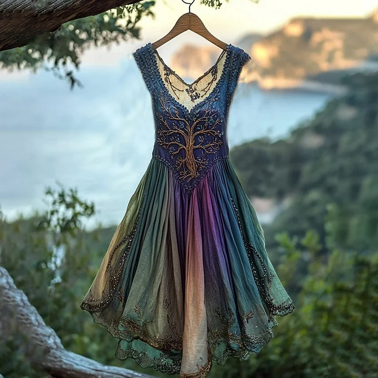 Women's Norse Mythology Celtic Knot Patchwork Linen Midi Dress