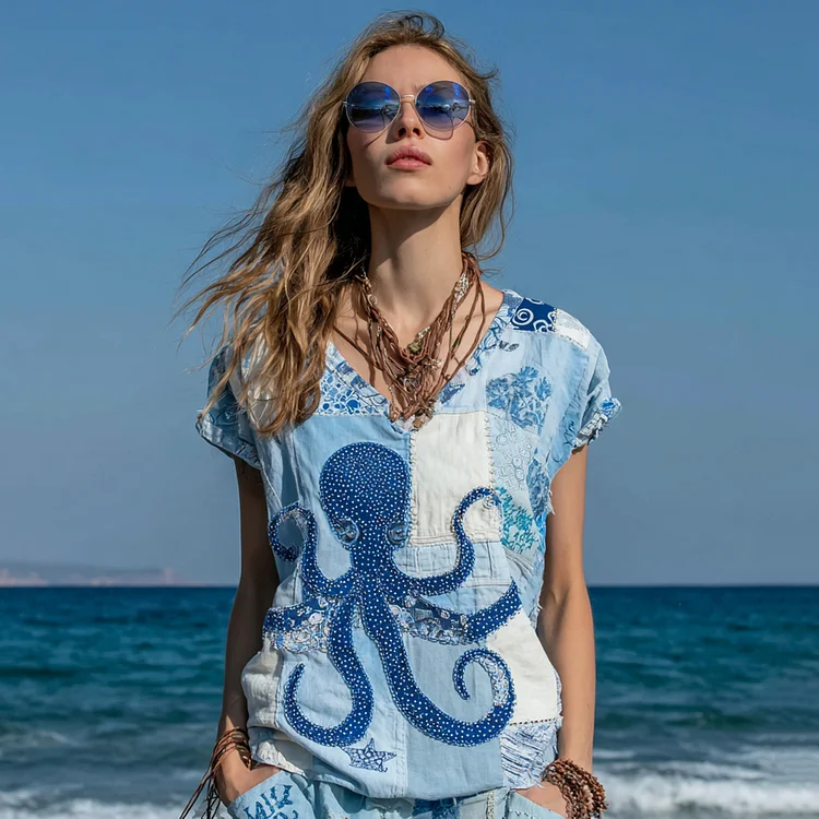 Women's Retro Japanese Octopus Art Stitching Casual Linen T-shirt