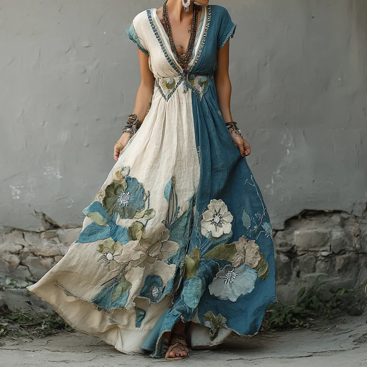 Women's Retro Japanese Sakura Artistic Linen Short Sleeve Dress