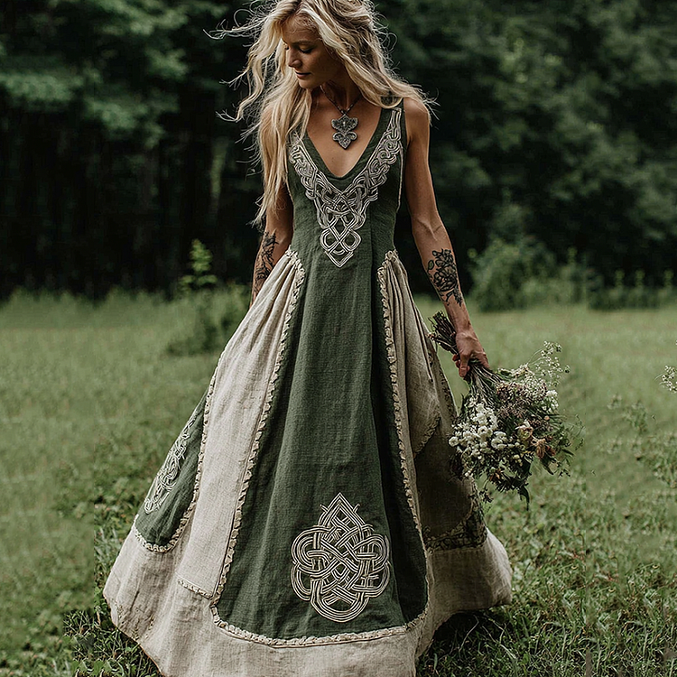 Women's Viking Celtic Color Block Art V-neck Maxi Dress