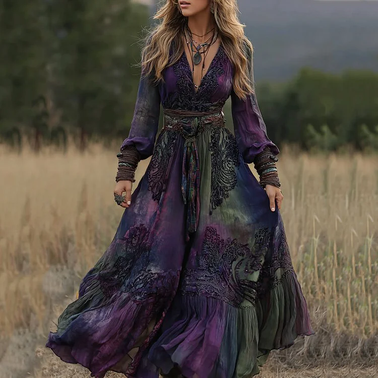 Women's Viking Celtic Gradient Floral Art V-neck Long Sleeve Maxi Dress