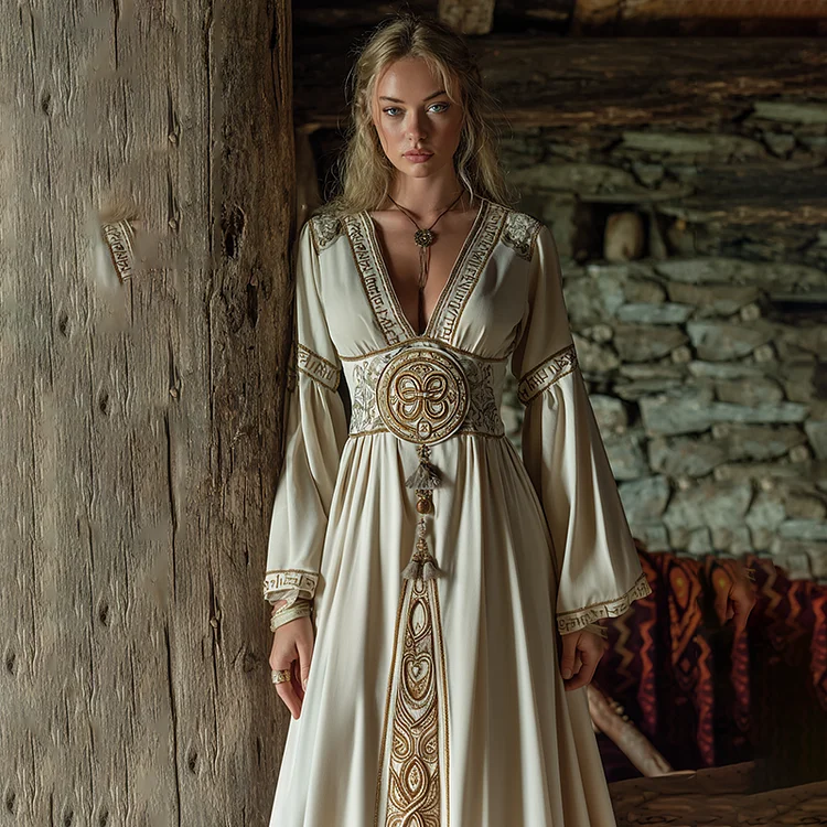 Women's Viking Celtic Knot Rune Art Pattern Cotton And Linen V-neck Dress