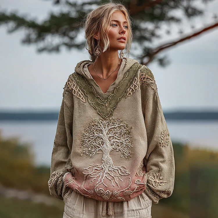Women's Viking Tree Of Life Celtic Knot Gradient Art Cozy Warm V-neck Hoodie