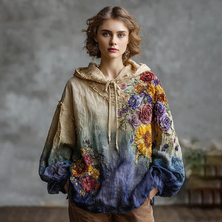 Women's Vintage Oil Painting Flower Art Gradient Print Hoodie