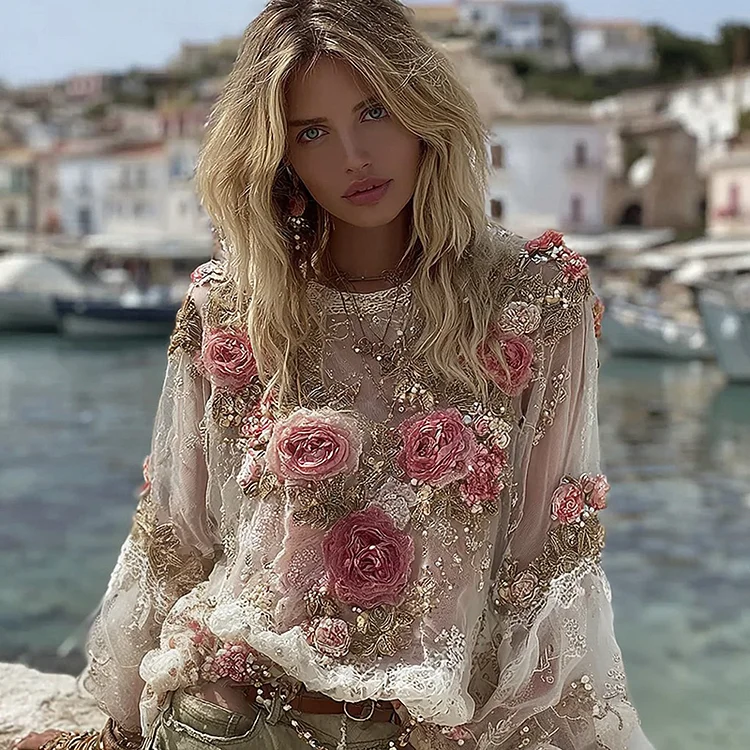 Women's Vintage Rose Floral Embroidery Casual Crew Neck Shirt